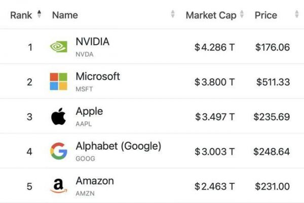 第三家是英伟达,于2024年6月加入3万亿美元俱乐部。