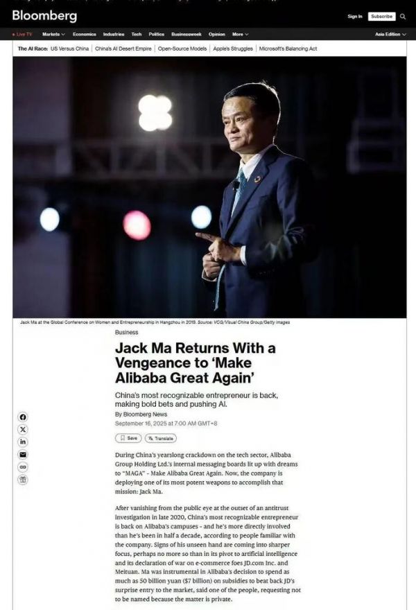 报道标题还起得挺“耸动人心”——《马云带着复仇之心回归,让阿里巴巴再次伟大》。