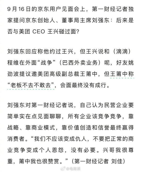 #刘强东喊话王兴不该成仇人# 刘强东隔空喊话王兴:尊重兴哥,也很赞赏王莆中,我们不应该变成仇人,没必要把正常商业竞争变成个人恩怨。