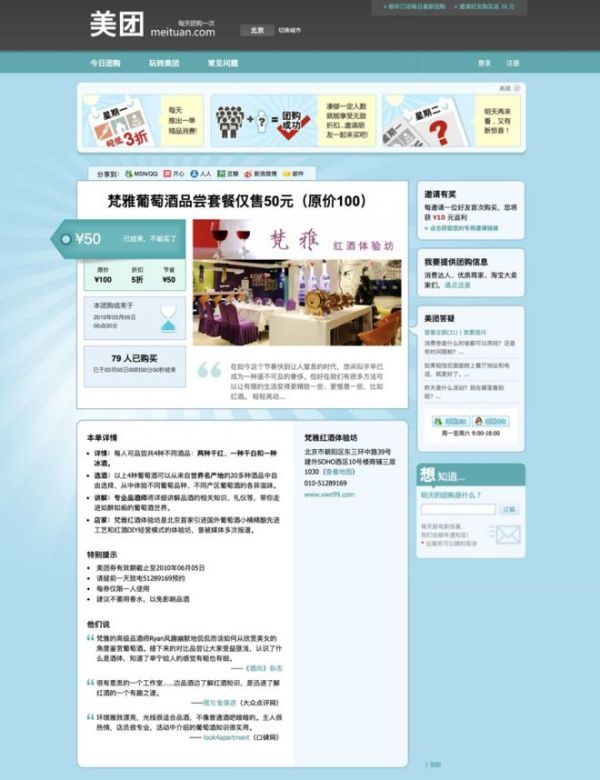 平台上线后推出的第一个产品是葡萄酒品尝套餐,对折的直白诱惑迅速带来第一桶金,当天销售79单,销售额近4000元,美团团购也在初出茅庐时就和省钱捆绑在了一起。