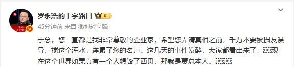 就于东来的最新表态,罗永浩也在微博上回应道:“于总,您一直都是我非常尊敬的企业家,希望您弄清真相之前,千万不要被损友误导,搅这个浑水,连累了您的名声。这几天的事件发酵,大家都看出来了,如果在这个世界如果真有一个人想毁了西贝,那就是贾总本人。”