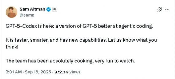 9 月 16 日,OpenAI 正式推出一款新模型 GPT-5-Codex ,这是一个经过微调的 GPT-5 变体,专门为其各种 AI 辅助编程工具而设计。该公司表示,新模型 GPT-5-Codex 的“思考”时间比之前的模型更加动态,完成一项编码任务所需的时间从几秒到七个小时不等。因此,它在代理编码基准测试中表现更佳。