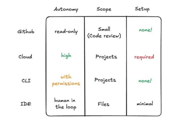 于是我们尝试更多形态,先重点做异步。现在我们又回过头,把 agent 带回到终端和 IDE。最终的目标是把它变成你身边的一个协作者,并且嵌入到你已经在用的开发工具里。