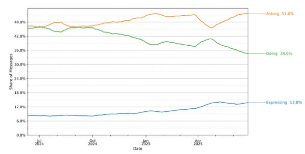图片来源:OpenAI论文也把用户动机拆解为三类:Asking(问)、Doing(做)、Expressing(表达)。总体上,「问」的占比最高(51.6%),「做」次之(超过三成),表达最少(仅一成)。但在工作相关场景中,情况发生了逆转:做跃升为 56%,写作又是最主要的「做」。