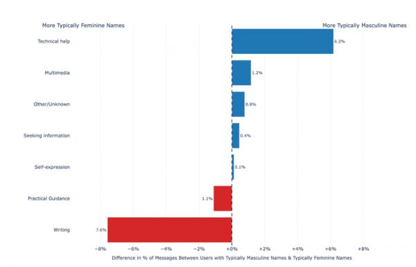 论文指出,虽然 ChatGPT 推出初期的用户以男性为主(约占八成),但到 2025 年中期,女性用户(52%)占比已经抹平甚至略微超越男性,并且在使用需求上有明显差异。