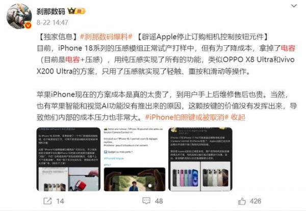 图源:微博据悉,电容与压感相结合的方案不仅成本高企,后续售后维修的报价也颇为昂贵。而且苹果的智能功能和视觉AI功能尚未正式推出,相机控制按键所蕴含的价值难以得到充分展现,这情况加重了苹果内部的成本负担。
