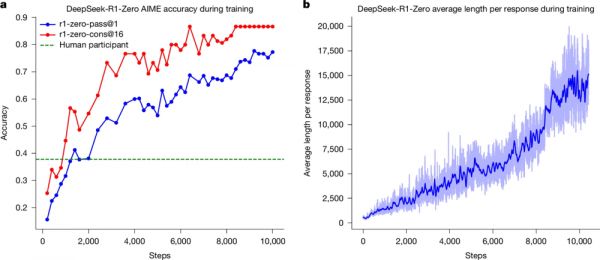 图1:DeepSeek‑R1‑Zero在整个训练过程中的准确率与输出长度。a,DeepSeek-R1‑Zero在训练过程中的AIME准确率。AIME以数学问题为输入、以数值为输出,其示例见扩展数据表1。pass@1和cons@16的说明见补充信息第4.1节。基线为AIME比赛中人类参赛者取得的平均分。b,DeepSeek-R1‑Zero在强化学习(RL)过程中于训练集上的平均回复长度。DeepSeek-R1‑Zero会自然地在更长思考时间下学习解决推理任务。注意,训练步(training step)指一次策略更新操作。