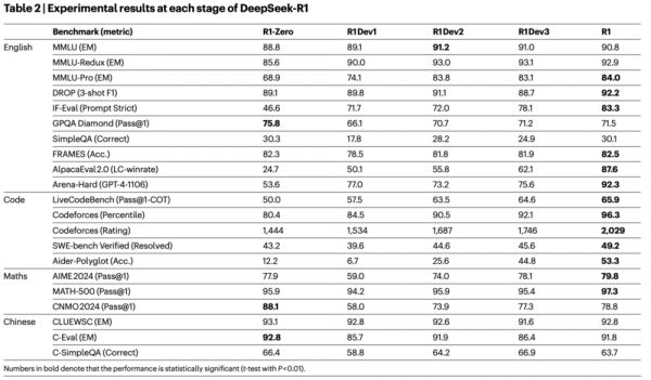 表2总结了DeepSeek‑R1在图2所示的多个开发阶段中的表现。将DeepSeek‑R1‑Zero与DeepSeek‑R1 Dev1比较,在指令跟随方面有显著提升,这在IF‑Eval和Arena‑Hard基准上的更高得分中得到体现。然而,由于冷启动数据集规模有限,Dev1的推理性能相比DeepSeek‑R1‑Zero出现一定下降,最明显的是在AIME基准上。相比之下,DeepSeek‑R1 Dev2在需要高级推理技能的基准上表现出显著提升,包括聚焦于代码生成、数学问题求解和STEM相关任务的基准。针对通用任务的基准(如AlpacaEval 2.0)仅显示出较小的改进。这些结果表明,以推理为导向的RL在影响用户偏好导向基准有限的情况下,仍能显著增强推理能力。
