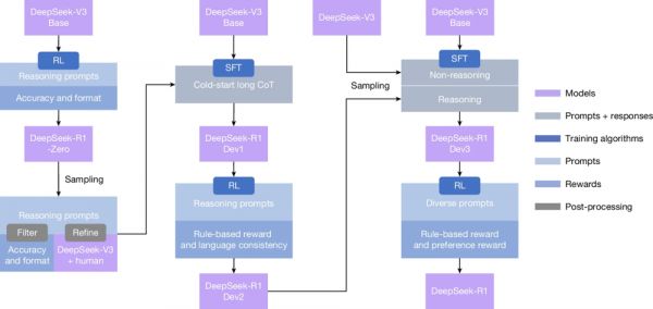 图2:DeepSeek‑R1的多阶段流水线。关于DeepSeek‑V3 Base和DeepSeek‑V3的详细背景见补充信息第1.1节。模型DeepSeek‑R1 Dev1、Dev2和Dev3表示该流水线中的中间检查点。