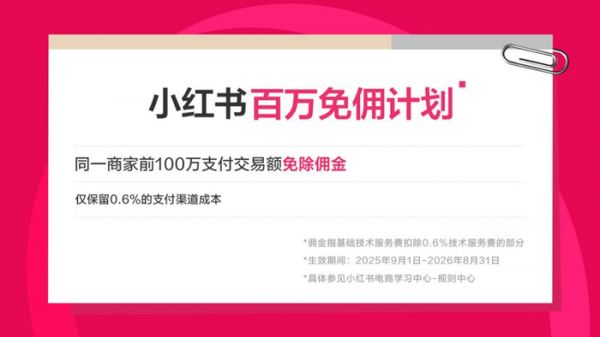与此同时,小红书还面向商家推出“百万免佣计划”,对同一商家收到的前一百万交易额免除佣金,仅保留0.6%的支付渠道成本。