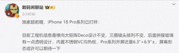 近日,博主@ 数码闲聊站爆料称,iPhone 18 Pro系列机型已进入打样阶段。
