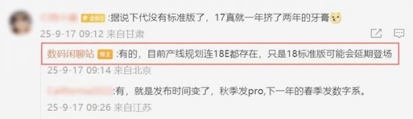 博主@ 数码闲聊站在回复网友评论时还提及,iPhone 18产品线中仍将包含“e”系列机型,即iPhone 18e;而iPhone 18标准版则可能面临延期发布。