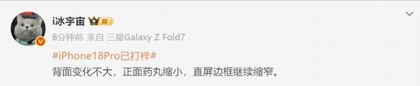 与此同时,另一博主@ i冰宇宙还透露,iPhone 18 Pro正面屏幕的“灵动岛”药丸会缩小,边框也会进一步收窄。