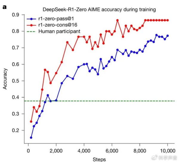 DeepSeek-R1-Zero 在训练过程中的 AIME 准确率,基线是人类参与者在 AIME 竞赛中取得的平均分数。来源:Nature