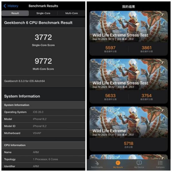 当然,这些体验升级的背后,比散热更核心的还是 A19 Pro 的升级,而散热也是为了更好地释放芯片的能力。作为台积电第三代 3nm 芯片,A19 Pro 在性能和能效上都有很明显的进步,性能体现在跑分就是 Geekbench CPU 分数来到了单核 3772、多核 9772,3DMark Wild Life Extreme(单轮)测试下来的分数也来到了 5718。