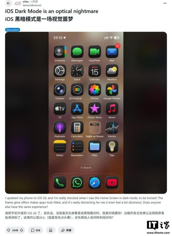 不过部分用户反馈,使用 iOS 26 时出现了图标似乎倾斜的视觉错觉,有人甚至因此感到头晕或方向感紊乱。相关讨论在 Reddit 上迅速发酵,有条帖子直言“整个 iOS 26 都是视觉噩梦”,在IT之家发稿前,获得超过 3000 个点赞。