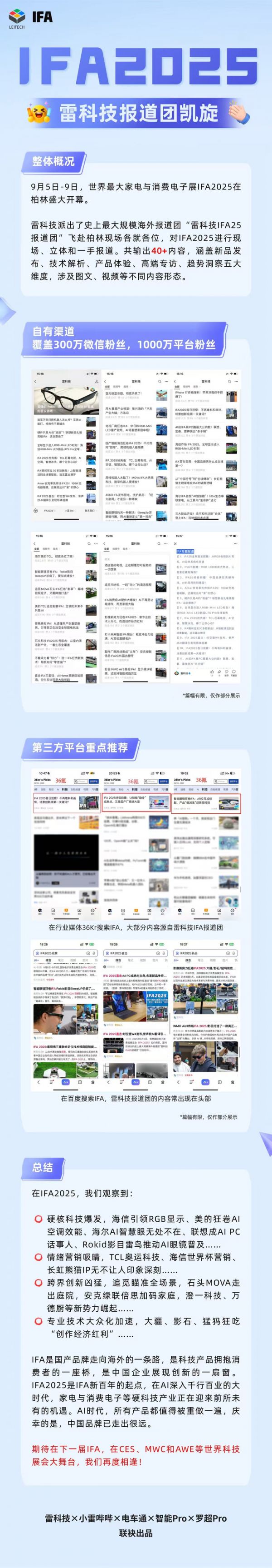 雷科技派出了史上最大规模海外报道团“雷科技IFA25报道团”飞赴柏林,对IFA2025进行现场、立体、一手报道。共输出40+内容,在雷科技300万微信粉丝矩阵、1000万新媒体矩阵传播,全网阅读量/播放量预估超500万。我们对IFA2025的报道,再一次得到了DeepSeek的AI认证“全网最强”。