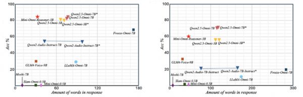 为了验证 Mini-Omni-Reasoner 的有效性,我们在 Spoken-MQA 数据集上测试了模型与多种不同类型方法的对比,模型相比于基座模型 Qwen2.5-Omni-3B 有明显的性能提升。