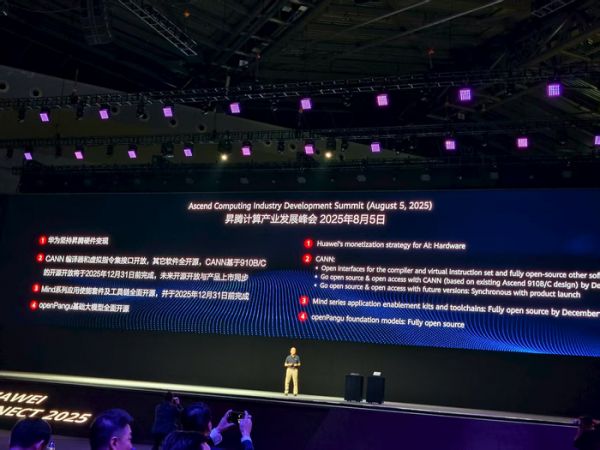 徐直军在会上重申了华为的开源策略和路线:一、华为坚持昇腾硬件变现;二、CANN编译器和虚拟指令集接口开放,其它软件全开源,CANN基于Ascend 910B/C的开源开放将于2025年12月31日前完成,未来开源开放与产品上市同步;三、Mind系列应用使能套件及工具链全面开源,并于2025年12月31日前完成;四、openPangu基础大模型全面开源。