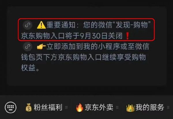 “京东购物”官方也发布公告表示,微信“发现-购物”中的京东购物入口,将于9月30日正式关闭。