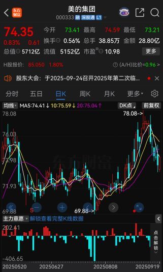 来源:美的集团截至9月19日收盘,美的集团A股股价报74.35元/股,涨幅为0.83%,总市值为5712亿元。