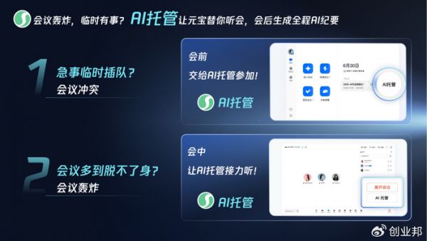 而AI托管功能的推出,则彻底颠覆了传统会议的参与模式。就像一个专属的“会议助理”,它能在用户分身乏术时,代为出席会议。无论是因堵车迟到、多个会议日程撞车,还是会中突发紧急事务需要离席,用户只需一键点击AI托管,元宝便会代为参会、完整记录,并在用户返回会议时,迅速提供此前错过的关键信息,实现无缝衔接。例如,当你在开会时突然接到客户电话,就可以将会议托管给元宝,处理完紧急事务后再无缝回到会议中,不会有信息断层。