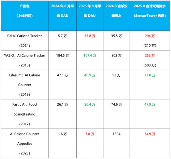 DAU方面,老产品YAZIO凭借积累依然排名第一且断崖领先,但趋势上,三款老产品的DAU相比去年8月均出现了下降,而Cal.ai和Appediet则分别增长了5.6倍和3.8倍。