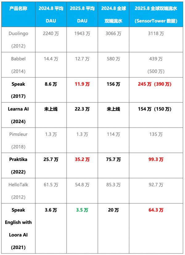 注2:AI产品的标准是,AI对话功能需要嵌入课程中,或作为主要练习方式。像Duolingo等以其他课程形式为主,AI功能仅为高阶订阅用户使用,或不在学习主流程中的产品,我们把它归类为传统产品。此外由于排名第五的AI产品ELSA,收入已排不进赛道Top10,且差距较大,这里就不再收录了