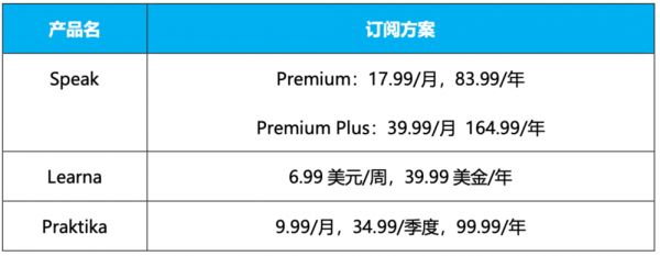 在Speak之下的两款AI产品分别是Learna(由土耳其厂商Codeway开发)和Praktika,这两款产品也以AI口语功能为核心,通过“低价+沉浸式体验”与Speak打出一定差异化。