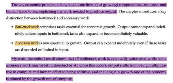 更残酷的是,Restrepo通过模型推导出:当所有“瓶颈工作”被自动化后,产出和算力呈线性关系,而工资则完全与增长脱钩。