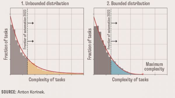 IMF经济学家Anton Korinek提出两种可能:如果任务复杂度没有上限(左图),自动化将无限推进,人类工作空间会被不断压缩;如果复杂度有上限(右图),自动化在某个点会停下,人类可能保留一部分永远不被替代的工作。