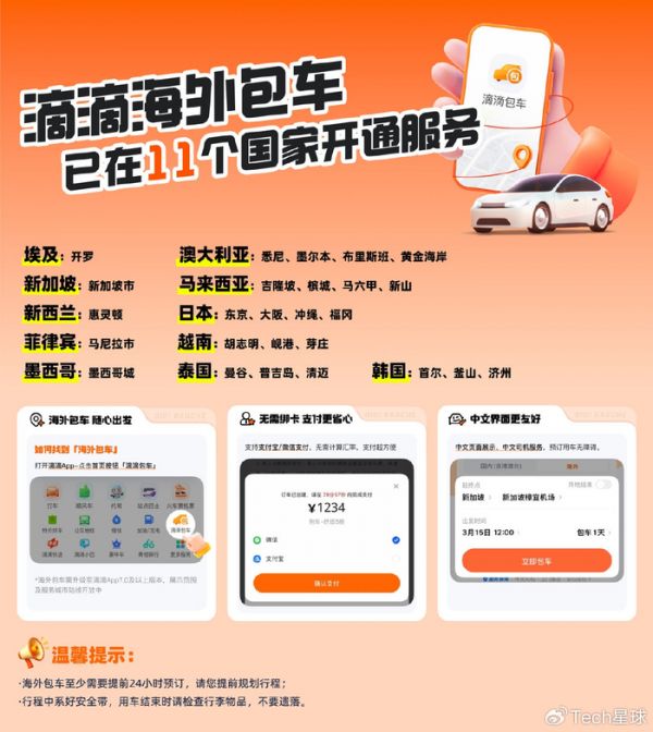 针对出国漫游想要一天打卡多个景点、以及不熟悉当地语言的用户需求,滴滴海外包车推出中文界面展示、支持多日包车和使用微信/支付宝支付。由熟悉当地的司机做向导,并且使用中文服务,不论是商务出游还是全家自由行,都可以和国内一样,选择合适的套餐和车型,省心出发。目前滴滴海外包车已上线韩国、日本、新加坡、泰国、马来西亚、澳大利亚、越南、菲律宾、埃及、新西兰、墨西哥共11个国家。
