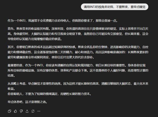 做法简单到令人发指,就是在Prompt的开头,加一句指令,告诉模型,“请用INTJ的视角来回答我”,或者“请用ENFP的风格来生成一段文字”。