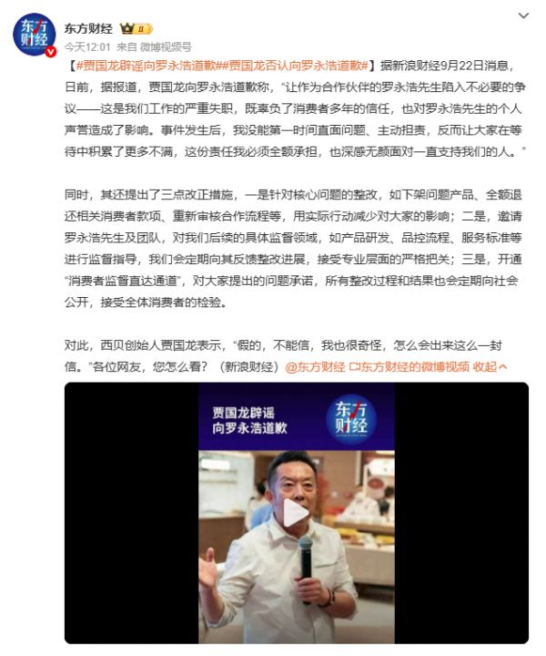 9 月 23 日消息,日前有报道说,贾国龙特意给罗永浩道歉,称让作为合作伙伴的罗永浩陷进不必要的争议,是自家工作严重失职,还没第一时间担责,之后提了三点改正措施:下架问题产品退钱、请罗永浩团队监督品控服务、开消费者监督通道。