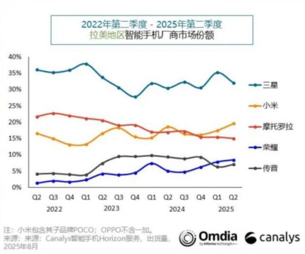 值得注意的是,近期荣耀手机业务在海外风生水起。根据市场调研机构Canalys报告显示,2025年第二季度,荣耀在拉美智能手机市场大幅增长70%,出货量创纪录地达到290万部,位列第四。荣耀二季度在欧洲市场也稳居前五,并且出货量还在持续增长中,同比增长11%。