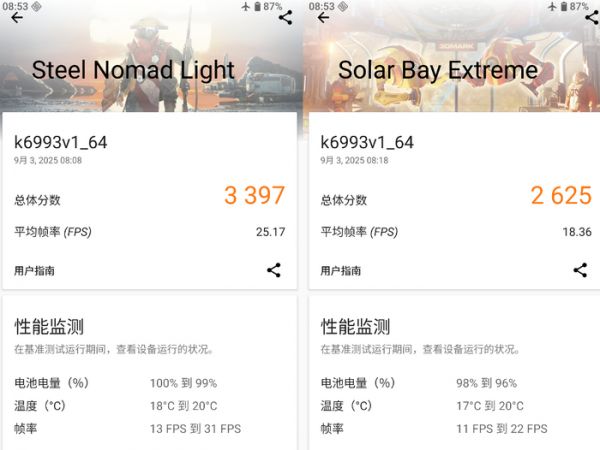 因此,今年的天玑9500将搭载最新的G1-Ultra GPU核心,搭载全新的Dynamic Cache架构,在性能与能效上有了显著的提升,且搭载主机级光追单元,性能较前代直接翻倍。所以,在3DMark的测试里,小雷选择了最具代表性的Steel Nomad Light和Solar Bay Extreme两个项目,分别测试传统GPU性能和光追性能,得分分别是3397和2625。