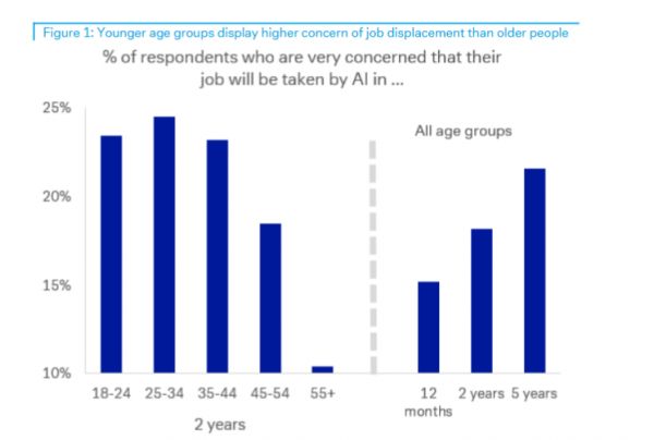 相比之下,55岁及以上的年长员工中,仅有10%的人持有同等程度的担忧。