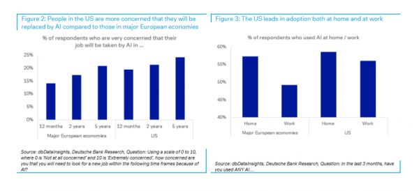 报告指出,美国人对AI取代工作的担忧程度普遍高于欧洲人。在未来两年的时间范围内,21%的美国受访者表示“非常担忧”,而欧洲这一比例为17%。报告认为,这可能反映了美国市场对AI技术更快的采用速度和更高的社会认知度。