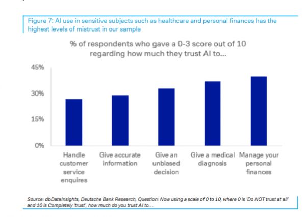 高风险领域信任度极低: 40%的受访者不信任AI管理其个人财务,37%不信任AI进行医疗诊断。