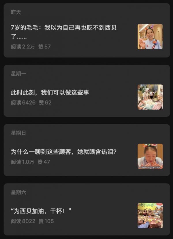 源Sight注意到,从推文内容看,该公众号似乎是一个西贝对基层员工进行公司文化和经营情况宣传的出口,而该号近期的文章内容,大多与“感恩西贝、感谢老板”“共渡难关”有关。