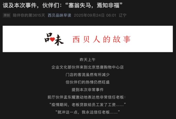 截图来源于西贝西贝品味早读公众号这些说法看似没有什么问题,但仔细想想,却又非常“别扭”——简单说,不管是对内还是对外,这些说法似乎都在强调西贝的“正确性”,甚至让员工和顾客变成自己的“信徒”,而忽略了在这一舆论危机当中,西贝做错了什么,学到了什么,没有做到“就事论事”。