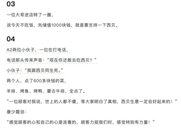 截图来源于西贝西贝品味早读公众号最近该公众号的推文内容,充满了西贝员工“感激、信任老板”的说辞,同时也引用了很多消费者的说法,比如“如果连西贝都不信任了,商场里其他餐厅还能信任谁呢?”“我的孩子是吃西贝长大的,现在我也带我的孙子孙女来吃西贝,你们服务这么好,一定会好起来的”,甚至还有“我跟西贝同生共死”这样让人大跌眼镜的言论。