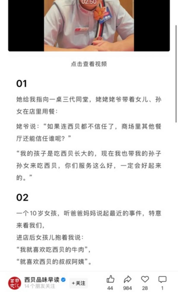 截图来源于西贝西贝品味早读公众号有网友评价,这些文章内容还能发出来,只能说明现在的西贝品牌宣传已经是贾国龙亲自“抓”了,什么事情都是越描越黑,甚至变成了“高级黑”,还是传统餐饮企业的老思维。