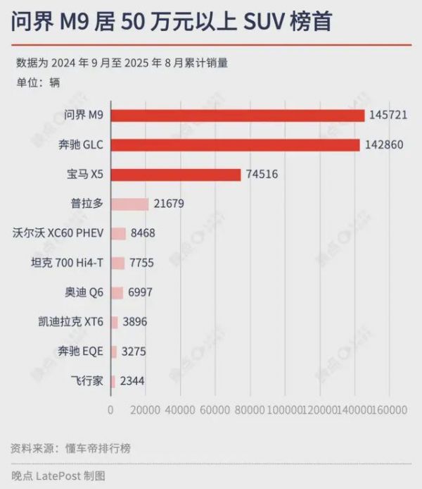 新能源浪潮改变了这一局面。2024 年,问界 M9 以 15 万辆的销量成为 50 万元以上 SUV 的销量冠军。进入 2025 年,其在新能源市场的七成市占率,显示出国产品牌开始在这一价格区间获得实质性的市场份额,并对传统豪华品牌的市场地位构成挑战。