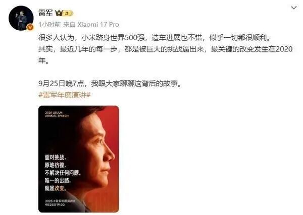 雷军在演讲预热视频中直言:“原计划6月办演讲,但内容太多,只能推到9月。”他还打趣说:“这样还能蹭小米17的流量。”显然,他也在用实际行动为小米17系列的发布造势。
