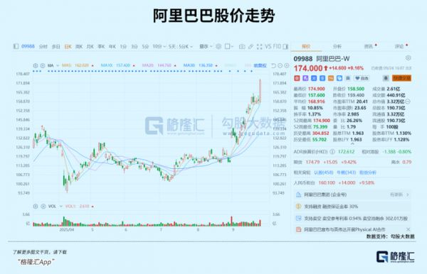 受此利好刺激,阿里巴巴的港股今天大涨9.16%,股价突破至174.0港元。创下2021年8月以来的历史新高时。