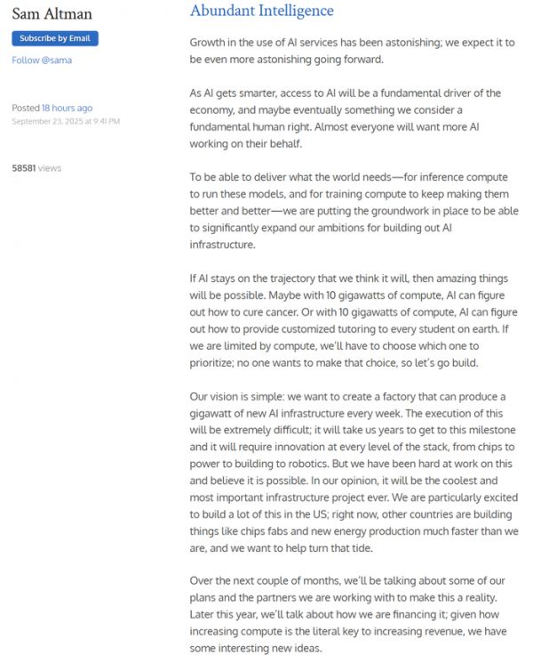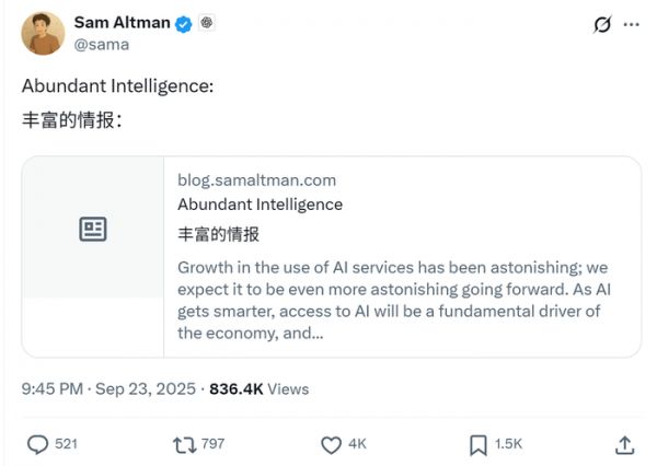 智东西9月24日消息,OpenAI创始人兼CEO萨姆·阿尔特曼(Sam Altman)9月23日发布博文《充裕智能(Abundant Intelligence)》,提出要在未来数年打造每周生产出1GW算力基础设施的AI工厂,并在在接下来的几个月里公布一些计划以及合作伙伴,以应对全球训练算力的激增需求。
