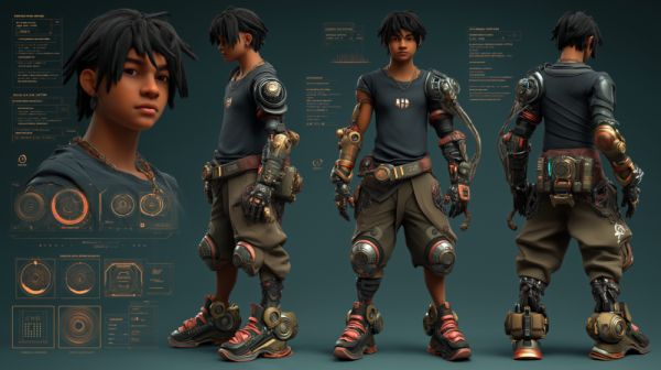 游戏开发者和玩家估计会爱上这个功能。我尝试生成一个「赛博朋克风格的年轻男英雄三视图」,它迅速给出了包含正面、侧面和背面的完整角色设计,连服装上的机械元素都清晰可见,质感堪比专业概念稿。
