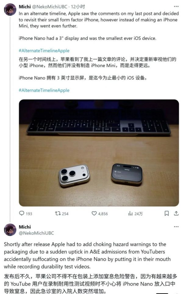 @NekoMichiUBC 在后续评论中指出,这款如此紧凑的机身设计将严重压缩电池空间,续航可能仅能维持半天,实用性存疑。苹果早已放弃小屏旗舰路线,市场数据也印证了这一策略。