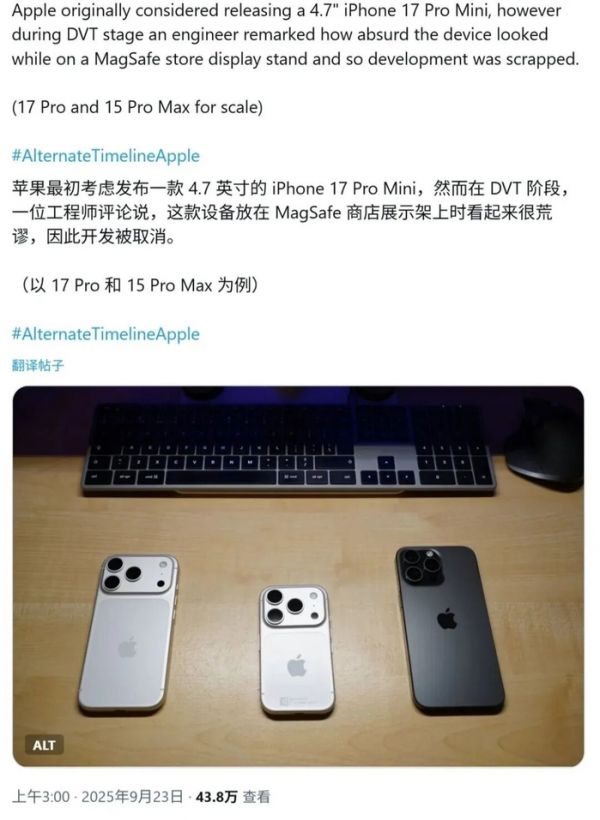 9月24日消息,消息源 @NekoMichiUBC 昨日(9 月 23 日)在 X 平台发布推文,报道称苹果最初考虑发布 4.7 英寸的 iPhone 17 Pro Mini,不过在设计验证测试(DVT)阶段一位工程师认为,这款设备放在 MagSafe 商店展示架上时看起来很荒谬,因此开发被取消。